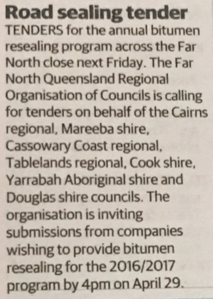 The tender for the 16/17 Bitumen Reseal & Register of Pre-Qualified Suppliers has just closed, having been open throughout April. I am pleased to advise that the arrangement has generated much interest from the market and the tender briefing which took place at Cairns Regional Council was well attended. We even managed to get our own article in the business section of the Cairns Post which came as a pleasant surprise last weekend.